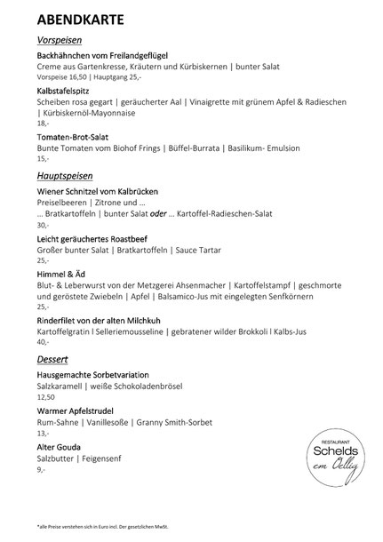 Im Oktober 2017 hat Alexander Scheld, Inhaber und Küchenchef, das „Schelds em Oellig“, direkt gegenüber der Agneskirche und mitten im Veedel, mit neuem Konzept eröffnet: Weg vom reinen Kneipenbetrieb, hin zu gehobener Gastronomie ohne Schnickschnack und zu moderaten Preisen. Das Haus verbindet Tradition mit Moderne, bietet die Klassiker der deutschen, gutbürgerlichen Küche, neu und „crossover“ interpretiert. Feinbürgerlich nennen wir das.